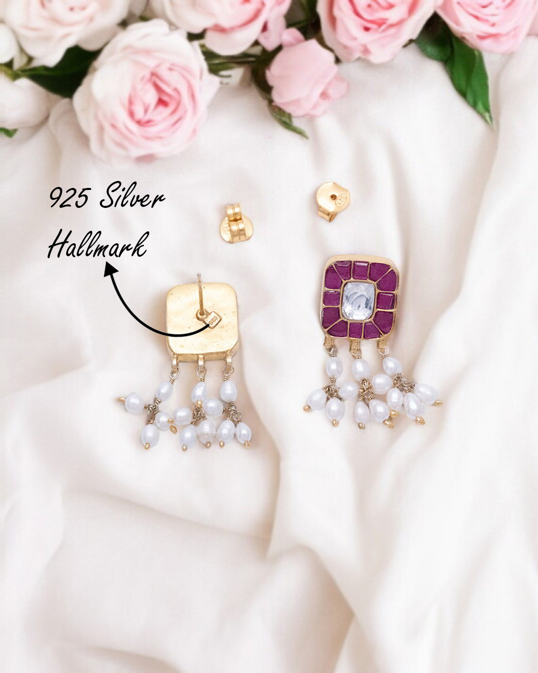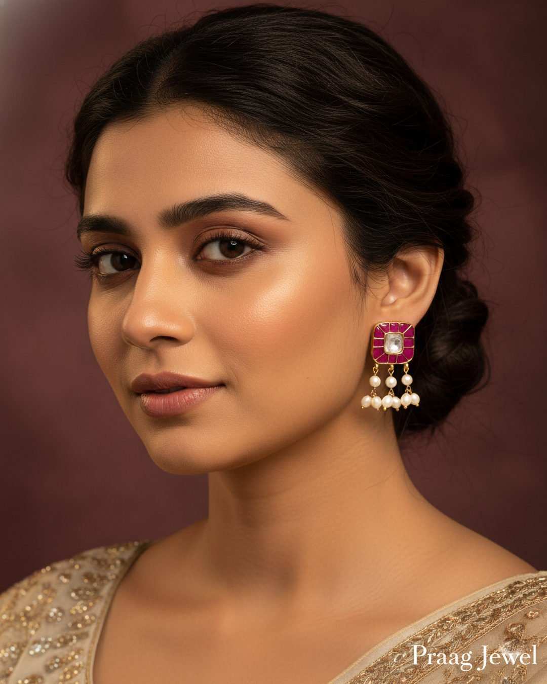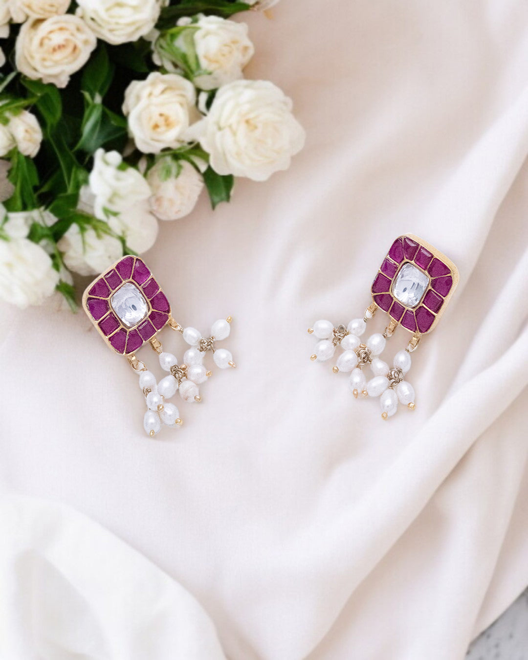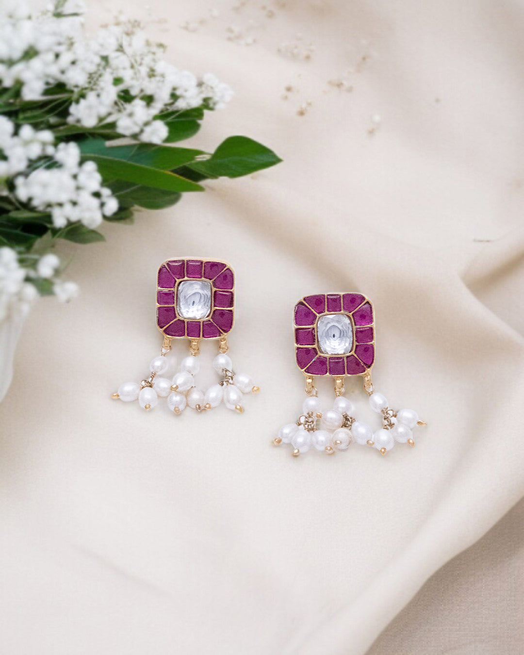 Radiate timeless grace with these Handcrafted Kundan Earrings with Freshwater Pearls. Designed in a regal square motif adorned with deep ruby stones and a luminous polki center, each piece is finished with delicate pearl danglers that sway with every move.