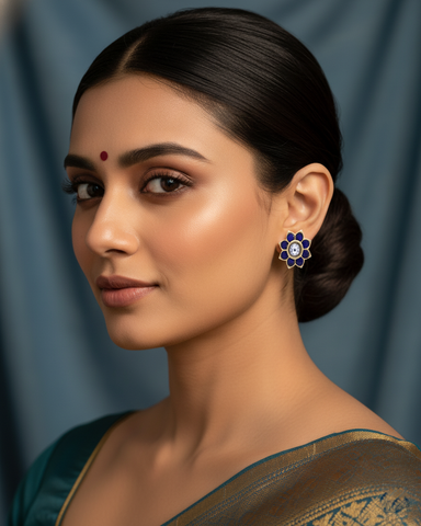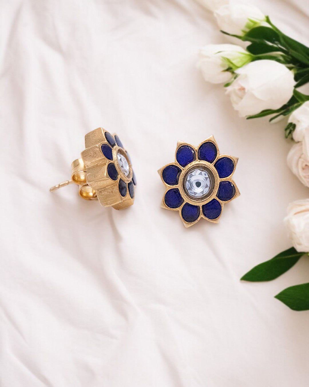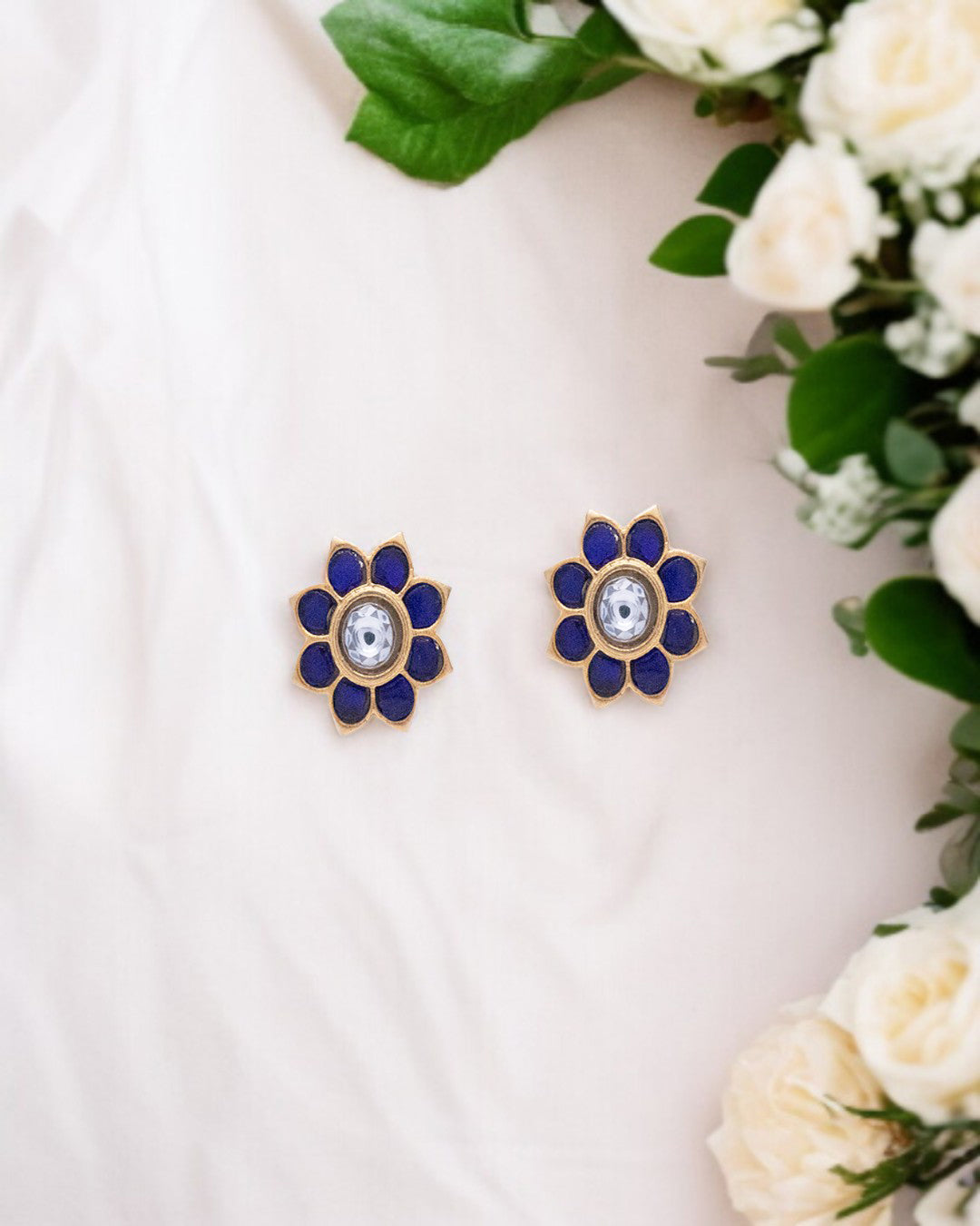 A celebration of classic beauty and handcrafted artistry, these Antique 925 Silver Kundan Floral Earrstuds capture the essence of traditional Indian elegance. The design features a radiant flower motif adorned with royal blue enamel work and a gleaming Polki stone at the center, symbolizing purity and grace.