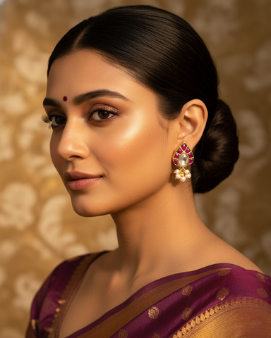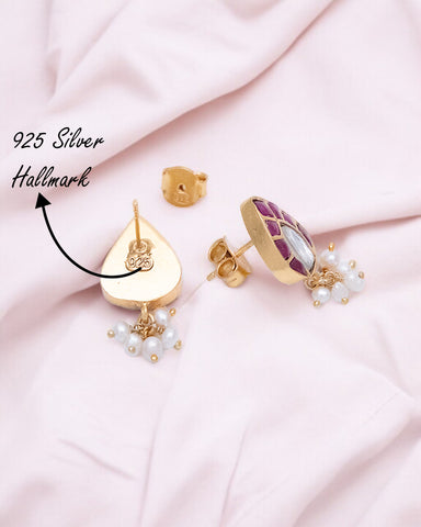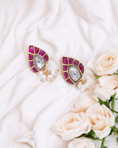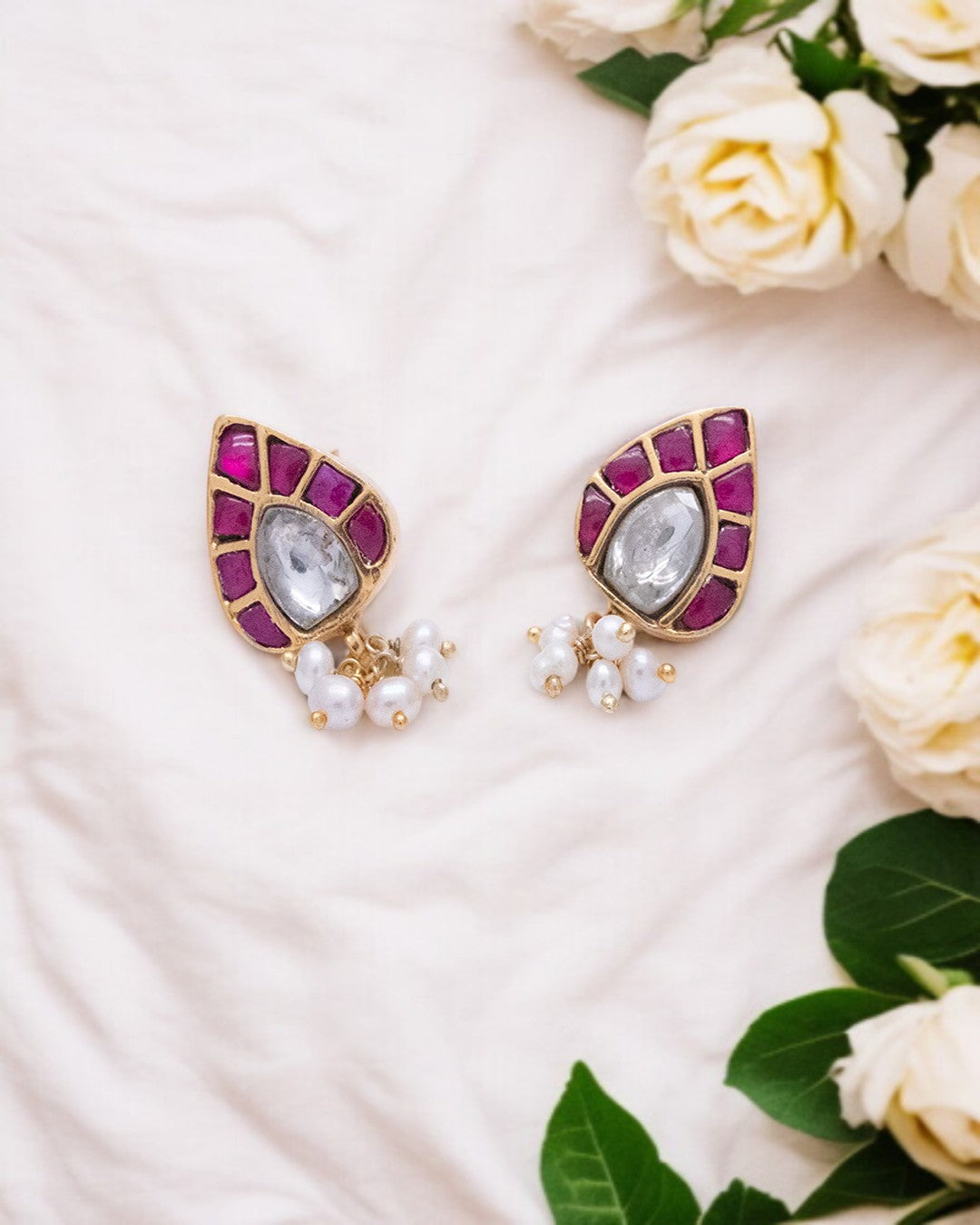 Elevate your festive look with these handcrafted 925 Silver Kundan Teardrop Earrings with Freshwater Pearl. Featuring a radiant Polki center and pearl drops, they capture timeless royal elegance and add a touch of grace to every occasion.