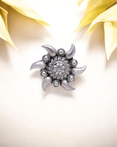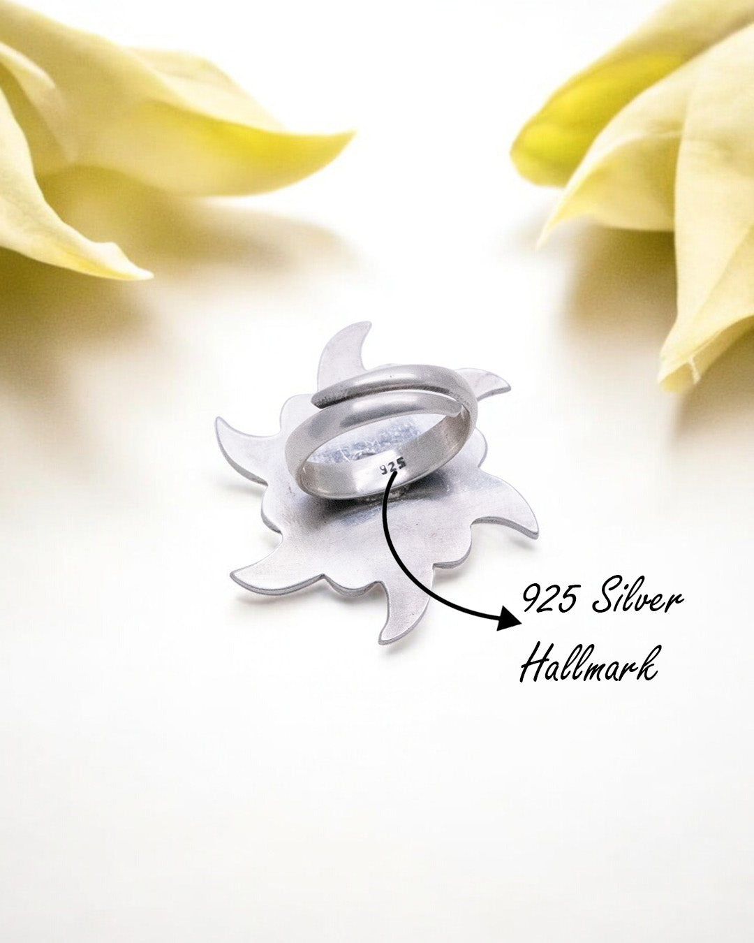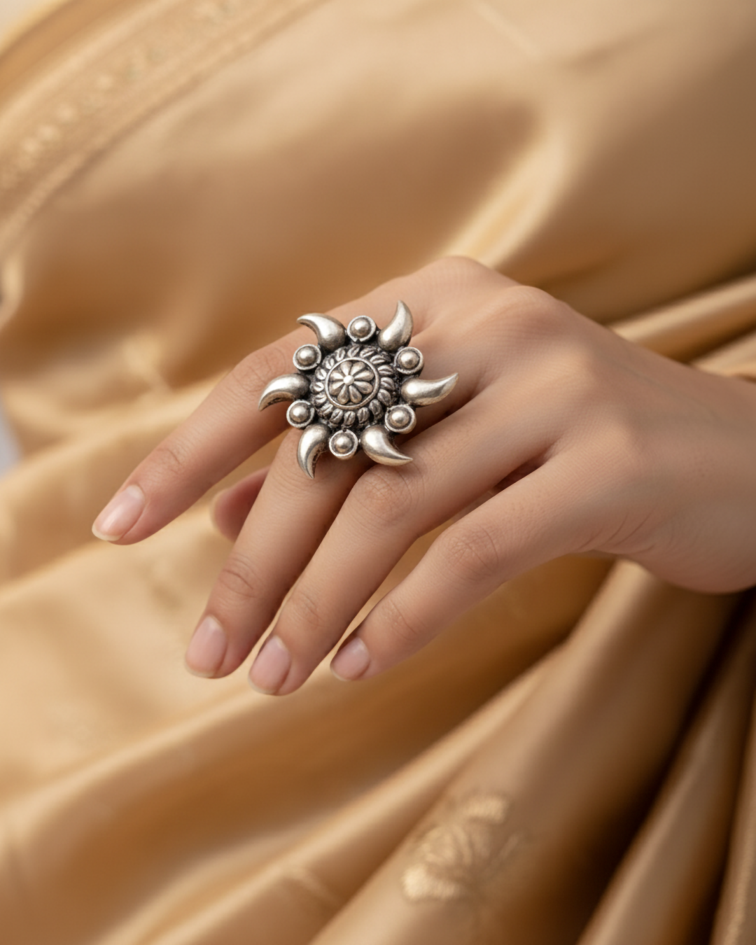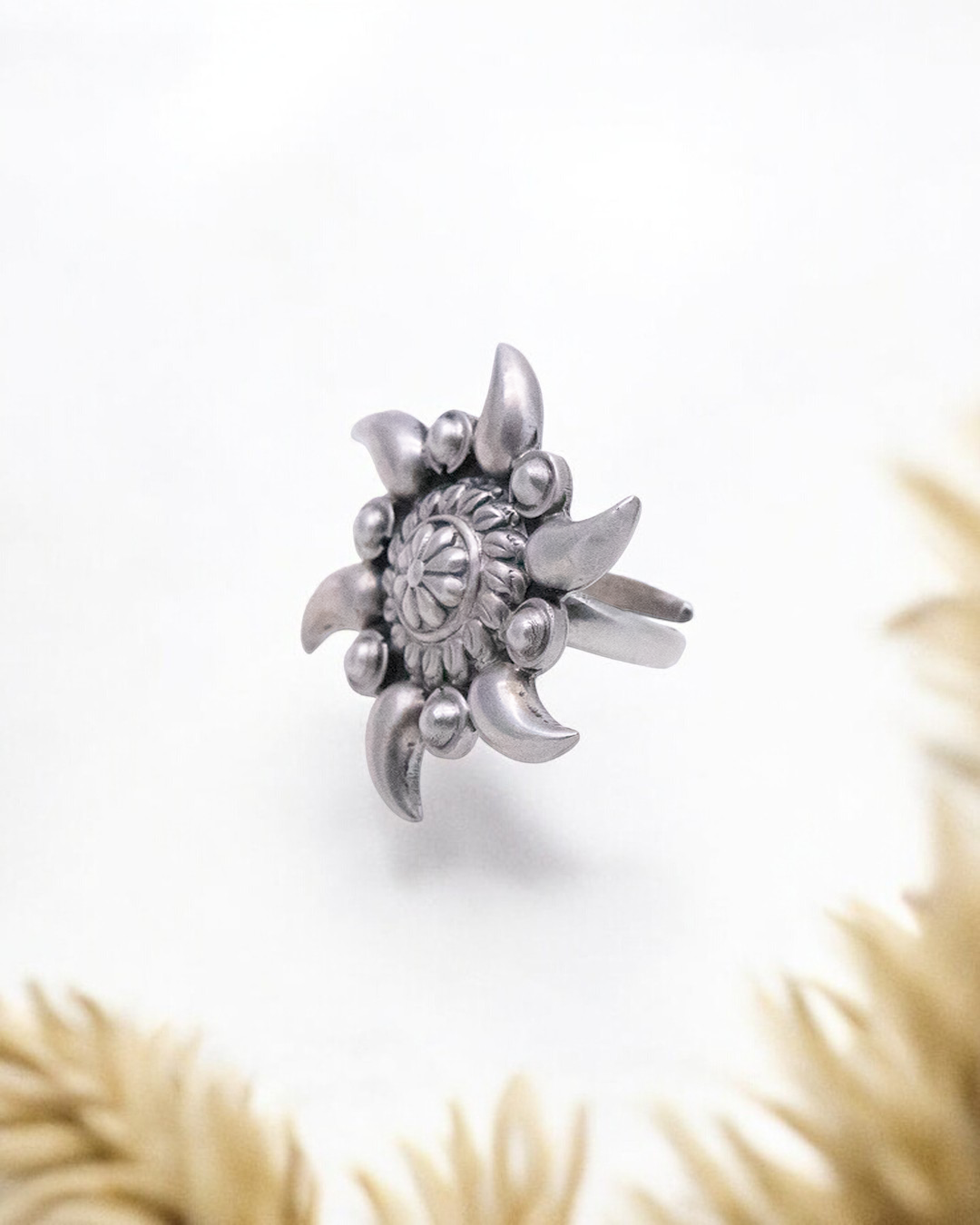 Bold yet beautifully feminine — this handcrafted Sudarshanam Silver Ring With Oxidized Polish captures the essence of timeless Indian artistry. Each petal is shaped by skilled Jaipur artisans, celebrating the charm of heritage craftsmanship and the allure of antique silver. With its adjustable band, this ring promises a perfect fit for all. Whether you pair it with a silk saree, cotton kurta, or modern attire, it effortlessly adds a touch of handcrafted grace to your look.